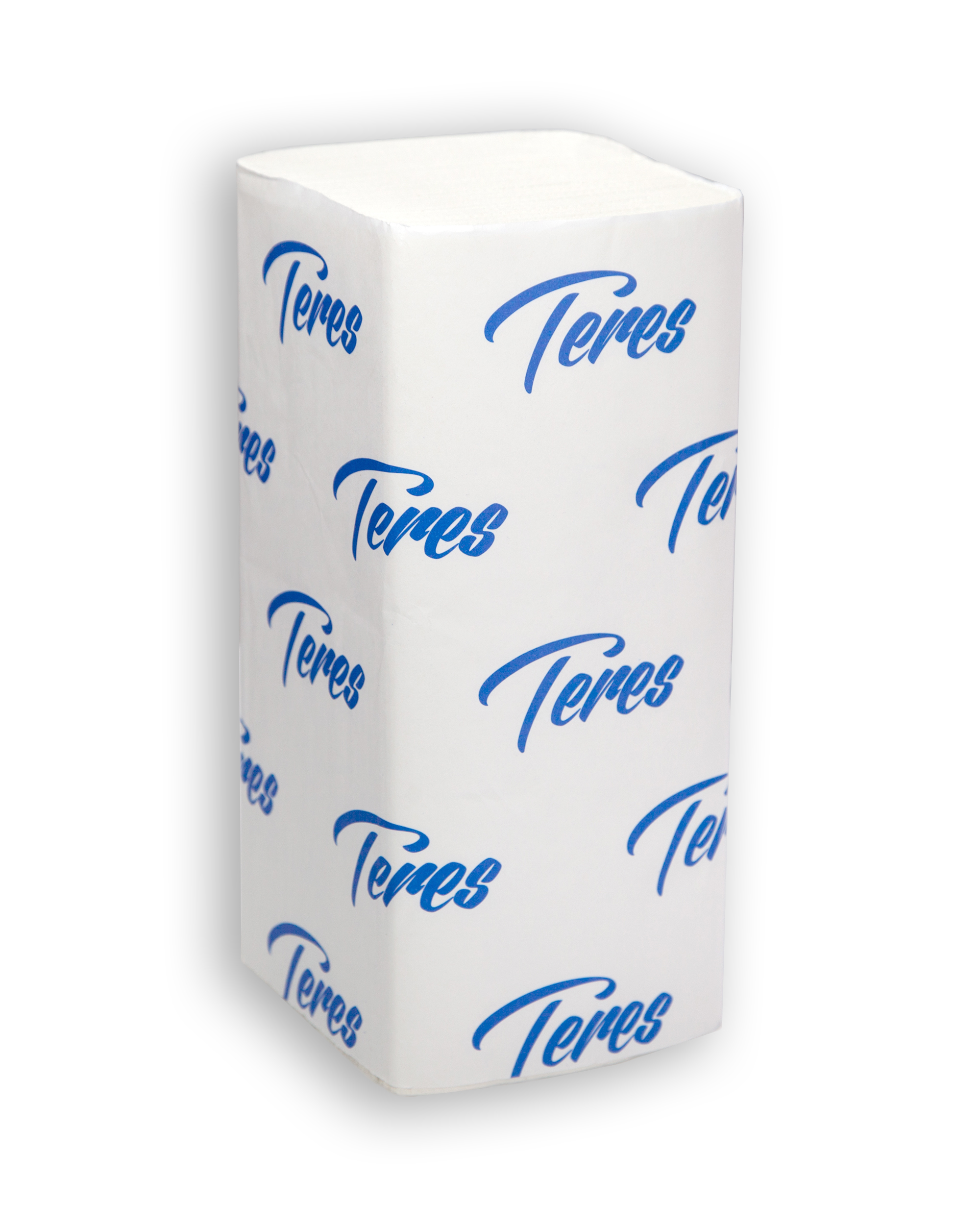 Двухслойные бумажные листовые полотенца «Терес» белого цвета, с тиснением, Z-сложения. Влагопрочные полотенца для держателей изготовлены из 100% целлюлозы. Плотность материала — 36 г/кв.м.